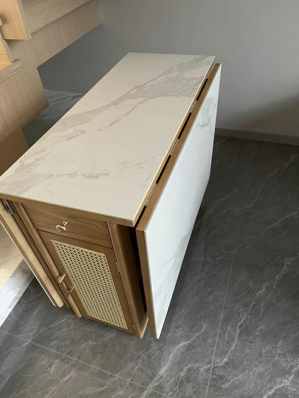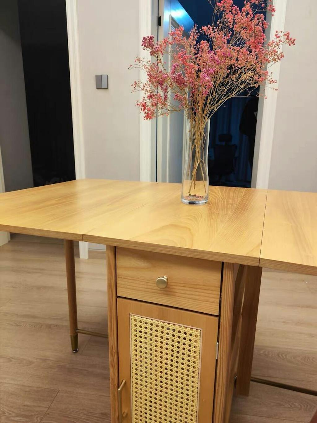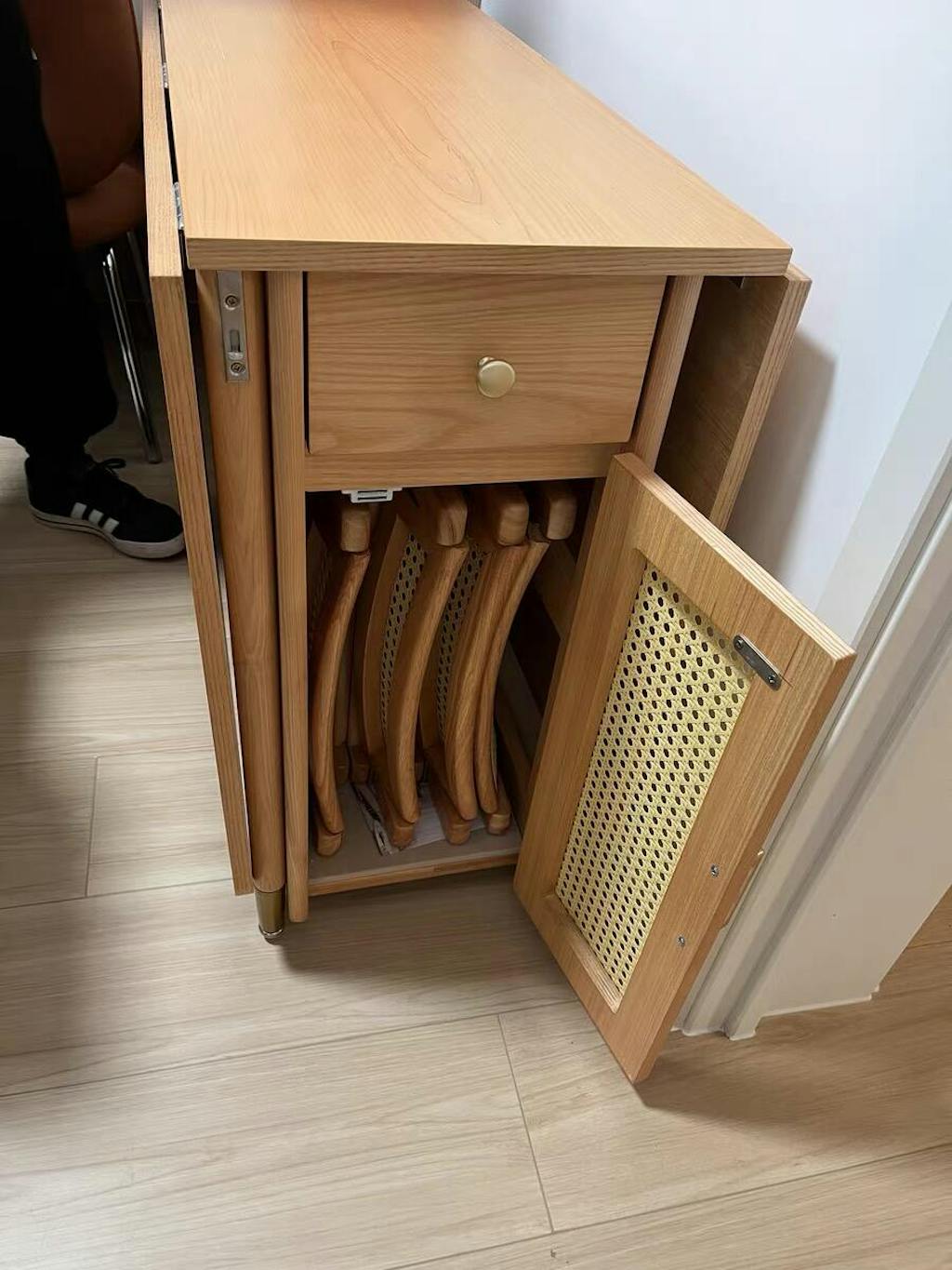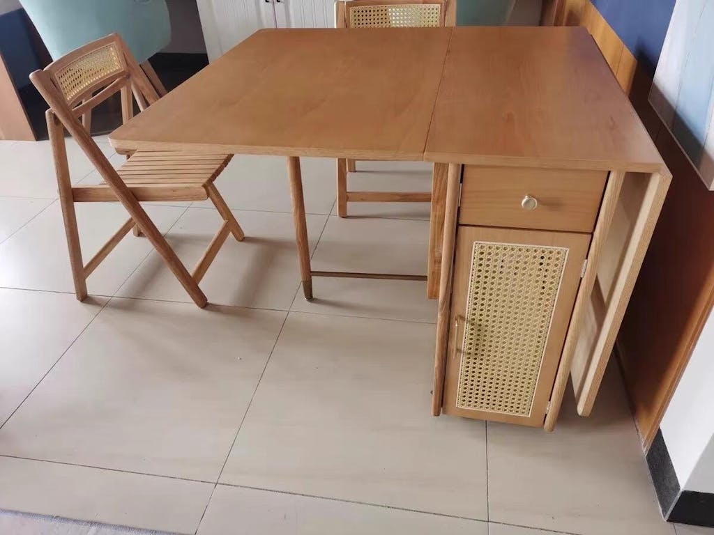 The Nydia dining room table is a modern dining table with a touch of natural beauty that offers ample storage space and style. Unlike other extended oak dining tables, this table has two rattan doors that open to reveal space to store all your dining essentials. The folding dining table and chairs make it easy to store when not in use, allowing for more space in your dining room. Made from high-quality materials, this table is a durable and long-lasting option for any home.