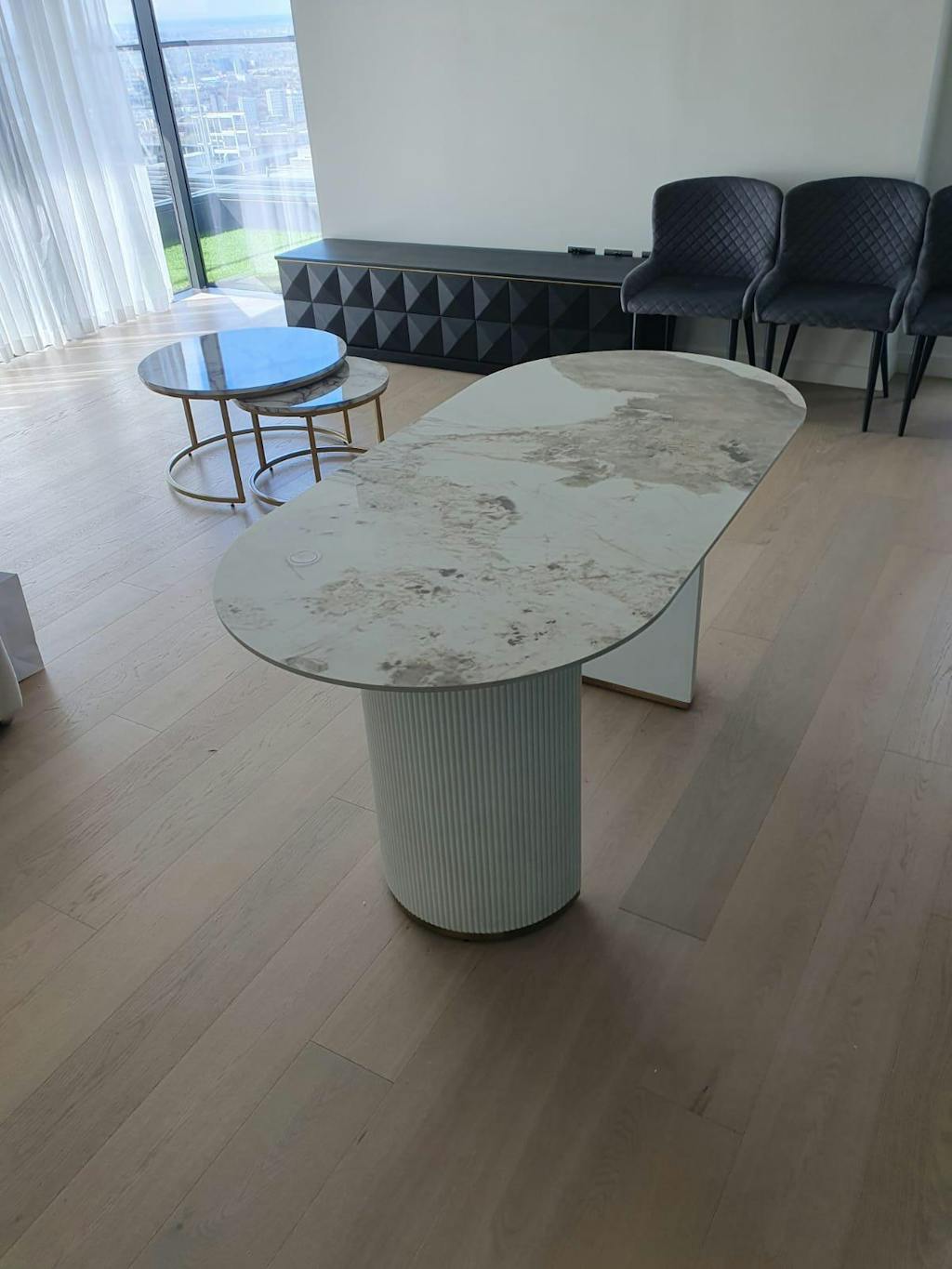 So happy with this lovely modern dinning room table and chairs. Looks great and chairs very comfortable. Was very easy to put together and had excellent customer service from the company